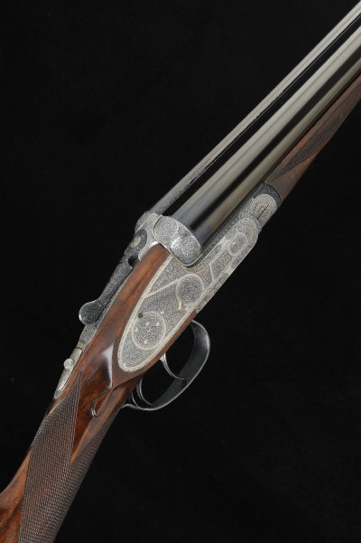 AYA A 12-BORE NO.1 MODEL SIDELOCK EJECTOR GUN, NO. 16-03-439-98 28-inch chopper-lump barrels with 2 3/4-inch chambers, about true cylinder and improved cylinder choke borings, the frame, hand detachable locks and top lever with fine bouquet and scroll engraving and retaining all of its original bright finish, the trigger plate signed by the engraver "V. Unirsan", gold lined cocking indicators, rolled edge trigger guard, articulated front trigger, 15 3/4-inch well figured stock including rubber recoil pad, 7lb., Spanish nitro proof (1200 bar) S2 |