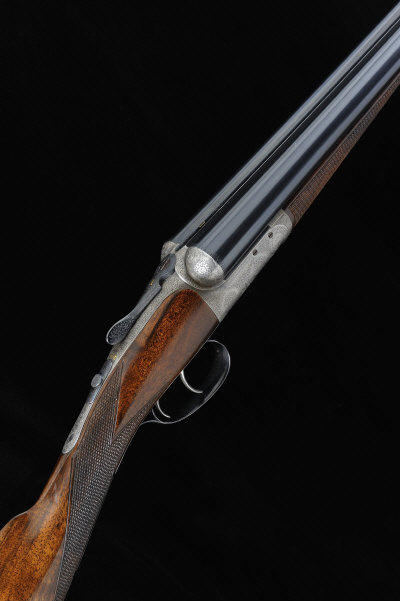 JOHN DICKSON & SON A 12-BORE ROUND ACTION EJECTOR GUN, NO. 7077 28-inch barrels with 2 1/2-inch chambers, about 1/4 and 3/4 choke borings, top extension, the frame and gold numbered top lever with fine bouquet and scroll engraving, retaining faint traces of original hardening colour, 14 1/2-inch well figured stock including rubber recoil pad, 6lb. 6oz., nitro proof, barrel wall thickness below recommended minimum, leather case S2 The maker confirms that the gun was built in 1926. |
