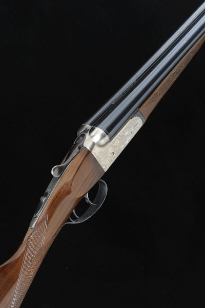 27-inch barrels with 2 3/4-inch chambers, about 1/4 and 3/4 choke borings, the frame and top lever with game scene decoration, 13 1/2-inch stock, 5lb. 10oz., Spanish nitro proof