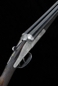 30-inch barrels with 2 1/2-inch chambers about improved cylinder and 3/8 choke borings, the frames, hand detachable locks and gold numbered top levers with scroll engraving and retaining traces of original hardening colour, 14 1/4-inch well figured stocks with ribbed butt plates, 6lb. 13oz., nitro proof, bores pitted, barrel wall thickness below recommended minimum, in their maker's brassbound oak and leather case