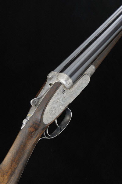 28-inch chopper-lump barrels with 2 1/2-inch chambers, about improved cylinder and 1/2 choke boring, the frame, locks and top lever with fine bouquet and scroll engraving and retaining traces of original hardening colour, 15-inch well figured stock with leather covered cheekpiece and including 1 1/2-inch extension, 6lb. 5oz., nitro re-proof, right bore diameter marginal, barrel wall thickness below the recommended minimum