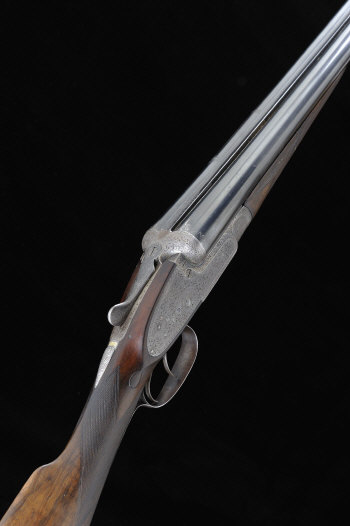 CHARLES OSBORNE & CO. A 12-BORE SIDELOCK EJECTOR GUN, NO. 51803 30-inch sleeved barrels with 2 1/2-inch chambers about 1/2 and full choke borings, the frame, locks and top lever with border and scroll engraving, the maker's name signed within a scrolling banner, lined cocking indicators, 14 1/4-inch figured stock including 1-inch extension, 6lb. 9oz., nitro proof |