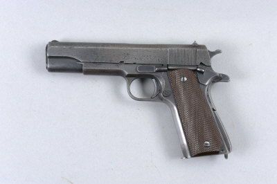 Union Switch & Signal Co. made 55,000 examples of the 1911A1 in 1943 only. This example retains many original features including grips, magazine and Du-Lite finish. The frame is marked with the inspection initials of Robert C Downie, Army Inspector of Ordinance