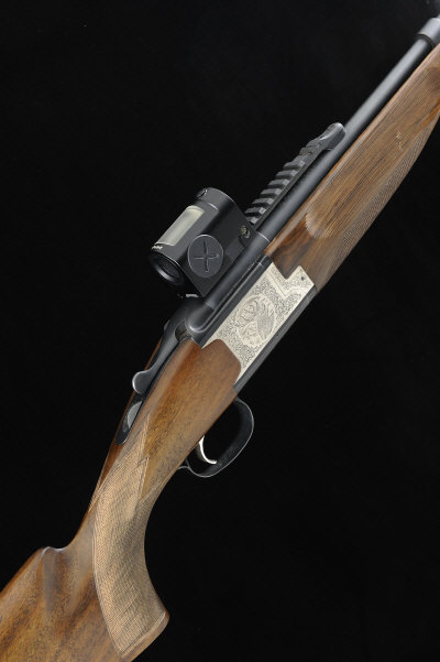 LAURONA A 9.3X74 SINGLE TRIGGER OVER AND UNDER EJECTOR RIFLE, NO. 227142 24-inch monobloc barrels with raised fore sight, the short raised rib mounted with a Zeiss Z-point sight, the frame and top lever with scroll decoration and engraved with stag and boar's head, 14 1/4-inch well figured stock with pistol grip, raised comb and rubber recoil pad, 8lb. 10oz., nitro proof S1 |