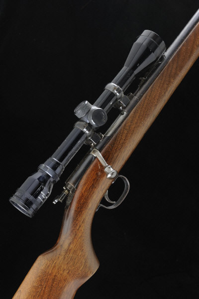 24-inch barrel threaded for a sound moderator, tangent adjustable rear sight, full length magazine tube, the receiver mounted with a Tasco 6x40 telescopic sight, half length stock with pistol grip and maker's butt plate, 13 1/2-inch pull, 6lb. 12oz., nitro proof