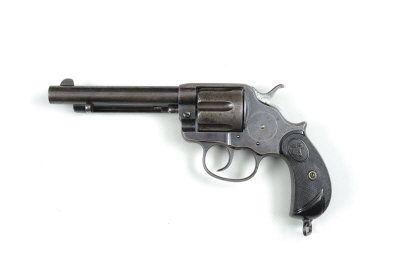 5 1/2-inch barrel with depot Pall Mall London address, ejector rod, solid frame with loading gate, chequered composition grips with rampant colt motif, lanyard swivel, black powder proof, worn overall, trigger return spring defective