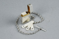A SILVER PLACE FINDER IN THE FORM OF A WATCH FOB the rectangular case with hinged cover, opening to reveal eight numbered ivory pegs in a silver gilt interior |