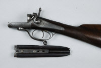 the rounded frame, rebounding back locks, hammers and rotary underlever with fine border and scroll engraving, 14 1/4-inch stock with steel butt plate; together with the action, stock and fore-end of a Joseph Lang 12-bore hammer gun, no. 3786 (2)