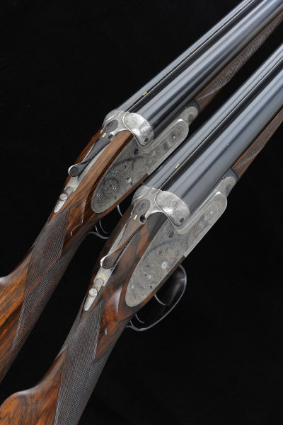 J. PURDEY & SONS A PAIR OF 12-BORE SELF-OPENING SIDELOCK EJECTOR GUNS, NOS. 27384/5 28-inch chopper-lump barrels with 2 3/4-inch chambers, about improved cylinder and 1/2 choke borings, the frames, locks and gold numbered top levers with fine bouquet and scroll engraving and retaining traces of hardening colour, lined cocking indicators, articulated front triggers and rolled edge trigger guards, 14 1/2-inch highly figured replacement stocks cast-on for the left shoulder, 7lb. 2oz., nitro proof, leather double case S2 The maker confirms that the guns were built in 1966. |