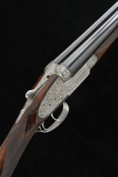 HOLLAND & HOLLAND A 12-BORE "ROYAL DELUXE" MODEL SELF-OPENING SIDELOCK EJECTOR GUN, NO. 33757, A TWO BARREL SET 30-inch chopper-lump barrels with 2 3/4-inch chambers, about 1/4 and 1/2 choke borings, the interchangeable 30-inch barrels with 2 3/4-inch chambers, about 1/2 and full choke borings, matted ribs, mid extensions, the frame, hand detachable locks and top lever engraved with bold foliate scrollwork surrounding game birds in flight, the maker's name signed within a banner, the fences deeply carved, gold lined cocking indicators, articulated front trigger, rolled edge trigger guard (for the left hand), 14 3/4-inch highly figured stock including leather covered recoil pad, 7lb. 4oz., nitro proof S2 The maker confirms that the gun was built in circa 1950 and was supplied with two sets of barrels from new. |