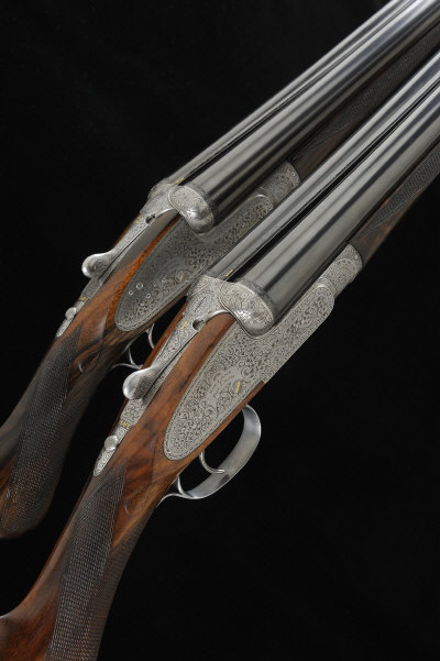 HOLLAND & HOLLAND A PAIR OF 12-BORE "ROYAL" MODEL SINGLE TRIGGER SELF-OPENING SIDELOCK EJECTOR GUNS, NOS. 40031/2 27-inch chopper-lump barrels with 2 3/4-inch chambers, about improved cylinder and 1/4 choke borings, the frames, hand detachable locks and gold numbered top levers with acanthus scroll engraving and retaining virtually all of their original bright finish, gold lined cocking indicators, rolled edge trigger guards, 15 1/2-inch highly figured stocks with semi pistol grips and 1 1/2-inch extensions, cast on for the left shoulder, 6lb. 10oz., nitro proof, in their lightweight leather motor case S2 The maker confirms that guns were built circa 1972. |