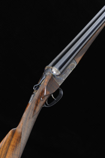 WEBLEY & SCOTT A FINE 12-BORE MODEL 702 BOXLOCK EJECTOR GUN, NO. 144016 28-inch barrels with 2 3/4-inch chambers about 1/4 and 3/4 choke borings, the frame with border and scroll engraving and retaining much original hardening colour, the 15 1/4-inch highly figured stock with side panels, 6lb. 10oz., nitro proof, full-length leather gun slip