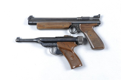 HY-SCORE A .22 AIR PISTOL, NO. 921430 10 1/2-inch barrel, chequered composition grip, retaining much original finish overall; together with a .22 Crossman "Medallist II" air pistol, no. 607576; and a leather shot flask (3) |