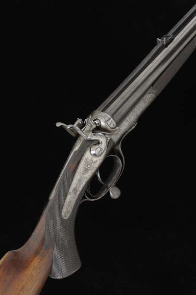 H. ALLPORT & SONS A .360 DOUBLE BARREL HAMMER RIFLE, NO. 12797 27-inch barrels with file-cut rib, rear sight with folding leaves to 150, the rounded frame, non-rebounding back locks, hammers and rotary underlever with fine scroll engraving, 14 1/2-inch well figured stock with pistol grip and steel butt plate, sling eyes, 7lb., black powder proof, in its leather case S58 |