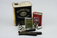 A SMALL GROUP OF GUNMAKERS ACCESSORIES including: gun powder tin, oil cans, snap caps, cleaning rod handles, etc |