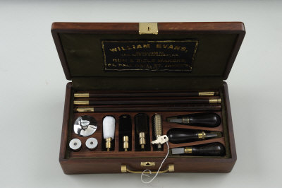 WILLIAM EVANS A GUNMAKERS CLEANING KIT suitable for a 12-bore, the walnut case containing turnscrews, oil bottle, snap caps, etc |