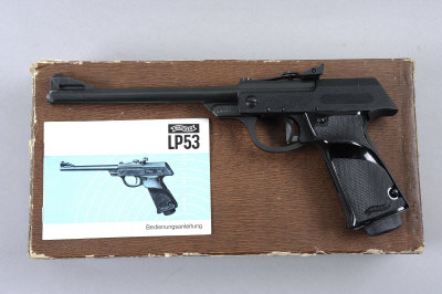 WALTHER A .177 LP53 AIR PISTOL, NO. 091011 9 1/2-inch barrel with adjustable rear sight, the crackle finished frame with chequered plastic grips, in its maker's box with instructions, spare sight elements, etc |