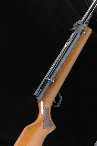 STERLING ARMAMENT CO A SCARCE .22 HR81 AIR RIFLE, NO. 1752 17 1/2-inch barrel with adjustable rear sight, underlever with spring-loaded catch, bolt action breech, the receiver with crackle finish, half length stock with pistol grip, raised comb and rubber recoil pad, 14 3/4-inch pull, 9lb. |