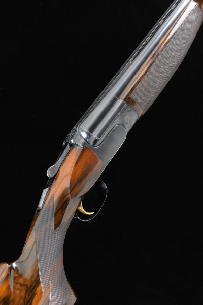 32-inch monobloc barrels with 2 3/4-inch chambers about 1/2 and 3/4 choke borings, machined ventilated rib, the plain blacked frame with border decoration, the maker's name signed in gold on the action base, gold plated trigger adjustable for reach, detachable trigger block, 15-inch well figured stock with pistol grip, 8lb. 5oz., Italian nitro proof, in its maker's case