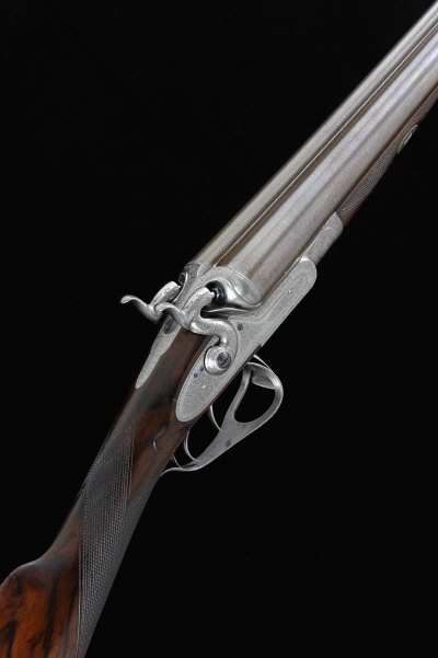 30-inch damascus barrels with 2 1/2-inch chambers, with recessed choke borings, the frame, rebounding bar locks, hammers and Purdey Second Patent thumb lever with fine scroll engraving, 14 3/4-inch highly figured stock including 2-inch extension, 7lb. 4oz., black powder re-proof