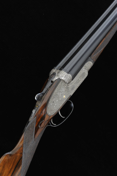 HOLLAND & HOLLAND A 12-BORE "ROYAL DELUXE" SELF-OPENING SIDELOCK EJECTOR PIGEON GUN, NO. 33645, A TWO BARREL SET the 27 1/2-inch chopper-lump barrels (numbered 1) with 2 3/4-inch chambers, about true cylinder and 1/4 choke borings, the 29-inch chopper-lump barrels (numbered 2) with 2 3/4-inch chambers, about 3/4 choke borings, matted and chequered flat top ribs, the frame, hand detachable lock and top lever profusely engraved with scrolling foliage around birds in flight, the maker's name signed within a banner and retaining some original hardening colour, the clipped fences carved with further scrolling foliage, gold line cocking indicators, articulated front trigger and rolled edge trigger guard, non-automatic safety catch, 14 3/4-inch well figured stock including rubber recoil pad, 7lb. 6oz. (7lb. 8oz. with additional barrels), nitro proof, re-jointing recommended, in its maker's lightweight leather case with compartments for both pairs of barrels S2 The maker confirms that the gun was built in 1948. |