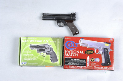 WEBLEY & SCOTT A .177 "SENIOR" MODEL AIR PISTOL, NO. S14226 Pre-War model, 6 1/2-inch barrel, frame with patent date and ribbed backstrap, chequered composition grips, mechanism slightly defective; together with a Dan Wesson 6mm BB revolver; a Colt "National Match" BB pistol; and a German field knapsack, cartridge bag, etc |