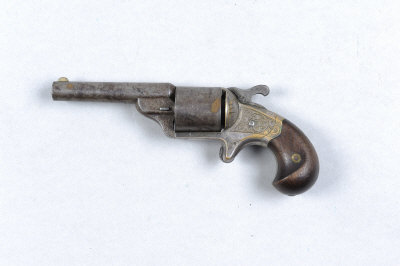 MOORE'S PAT FIREARMS CO. A .32 TEAT-FIRE REVOLVER, NO. 2418 3 1/4-inch barrel with hinged loading gate, smooth cylinder with patent date, silver plated brass frame with scroll engraving and spur trigger, smooth walnut grips S58 |