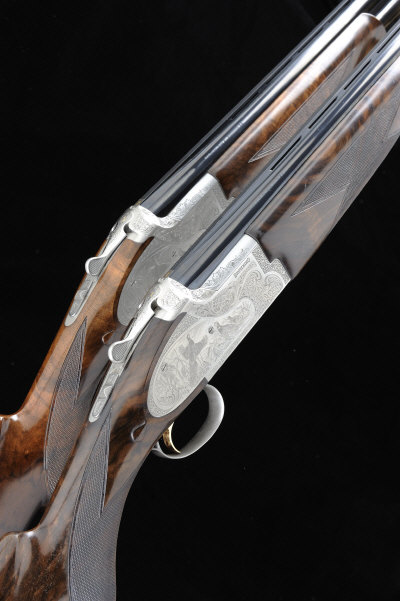 BROWNING A PAIR OF 12-BORE 325 HERITAGE MODEL SINGLE TRIGGER OVER AND UNDER EJECTOR GUNS, NOS. 57720 MN/57721 MN 30-inch barrels with 3-inch chambers and interchangeable choke tubes, machined narrow ventilated rib, the frames, side plates and gold numbered top levers engraved with foliate scrollwork around roses, the side plates with scenes of game, selective single triggers, 15-inch well figured stocks with pistol grips and maker's butt plates, 8lb., nitro proof, in their individual maker's cases with spare chokes, instructions, etc