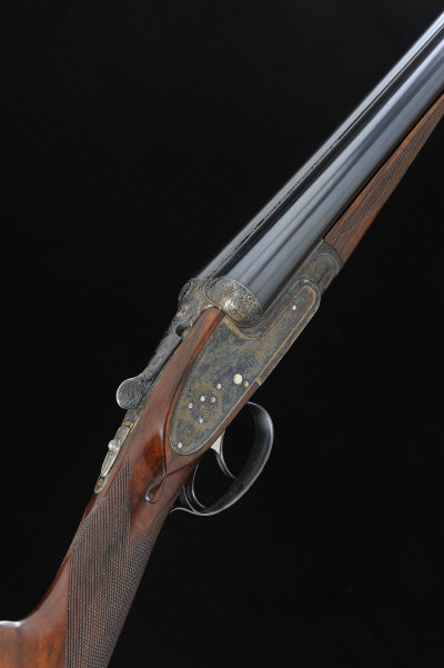 AYA A FINE 12-BORE NO.1 MODEL SIDELOCK EJECTOR GUN, NO. 384883 27-inch chopper-lump barrels with 2 3/4-inch chambers, about 1/4 and 3/8 choke borings, the frame, hand detachable locks and top lever with fine bouquet and scroll engraving and retaining virtually all of its original hardening colour, gold lined cocking indicators, articulated front trigger, rolled edge trigger guard, 14 1/4-inch well figured stock, 6lb. 7oz., Spanish nitro proof, in its canvas case S2 The gun appears little used. |