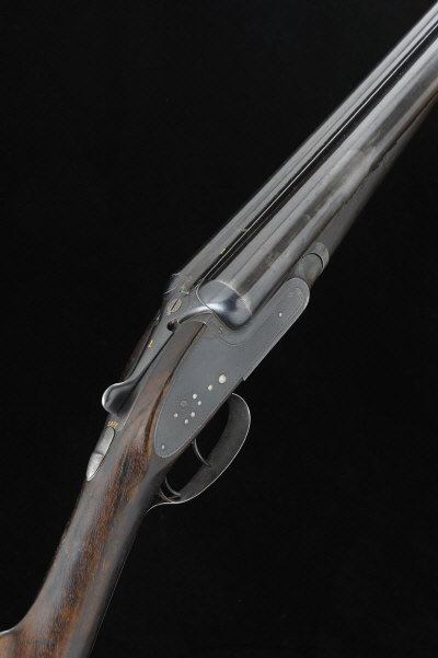 WILLIAM POWELL & SON A 12-BORE SIDELOCK EJECTOR GUN, NO. 11836 28-inch sleeved barrels with 2 1/2-inch chambers, about 1/4 and 1/2 choke borings, doll's head extension, the blacked frame, locks and gold numbered top lever with border engraving, 14 1/2-inch well figured stock including chequered butt plate, 6lb. 12oz., nitro proof S2 |