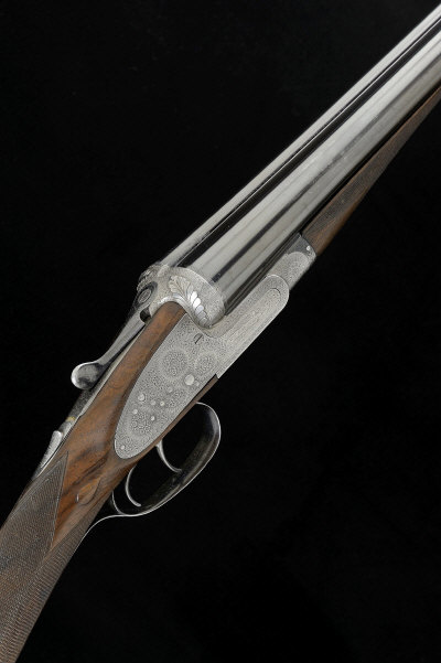 W. C. CARSWELL LTD. A 12-BORE SIDELOCK EJECTOR GUN, NO VISIBLE NUMBER 27-inch chopper-lump barrels with 2 1/2-inch chambers, about 1/4 and 1/2 choke borings, mid extension, the frame, locks and top lever with bouquet and scroll engraving, the maker's name signed within a scrolling banner, carved fences, 14 1/2-inch figured stock, 6lb. 10oz., nitro proof S2 |
