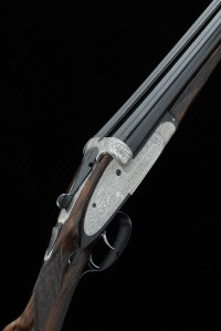 G. E. LEWIS & SONS A 16-BORE SIDELOCK EJECTOR GUN, NO. 15242 26-inch barrels with 2 3/4-inch chambers about 1/4 and 1/2 choke borings, the frame, locks and top lever engraved with fine scrollwork surrounding scenes of game and dogs in landscapes, the maker's name signed within a scrolling banner, the fences carved with floral designs, 14 1/2-inch highly figured stock including rubber recoil pad, 6lb. 1oz., nitro re-proof |