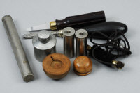 A GROUP OF GUNMAKERS ACCESSORIES comprising: oil bottle and snap caps by G. & J. Hawksley, turnscrew, striker key, pinfire loading tool, oil bottle and pull-through |