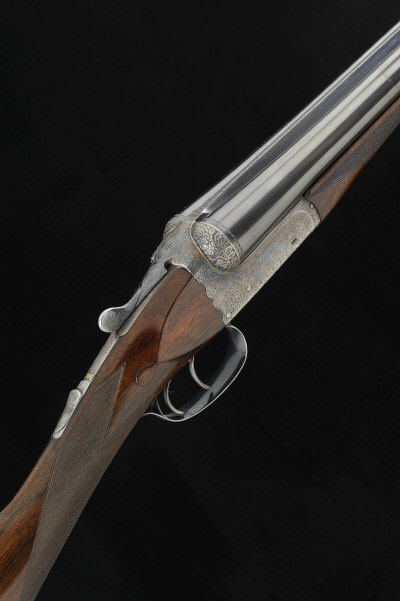 25-inch chopper-lump barrels with 2 3/4-inch chambers, about 1/4 and 1/2 choke borings, mid extension and file-cut Churchill rib, the scroll back frame and top lever with bouquet and scroll engraving and retaining some hardening colour, the fences carved with roses, 14 1/4-inch figured stock with ribbed butt plate, 6lb. 4oz., nitro re-proof, in its leather case