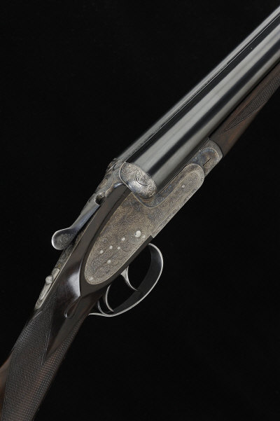 AYA A 12-BORE SELF-OPENING NO.2 MODEL SIDELOCK EJECTOR GUN, NO. 583214 26-inch chopper-lump barrels with 2 3/4-inch chambers, about 3/8 and 5/8 choke borings, Holland & Holland type self-opening mechanism, the frame, locks and top lever with scroll engraving and retaining much original hardening colour, lined cocking indicators, articulated front trigger, rolled edge trigger guard, 14-inch figured stock, including rubber recoil pad, 6lb. 8oz., Spanish nitro proof, re-jointing recommended, left barrel wall thickness below the recommended minimum S2 |
