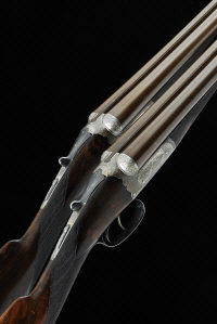 30-inch damascus barrels with 2 1/2-inch chambers about 1/4 and 1/2 choke borings, doll's head extensions, the scroll-backed rounded frames and patent top levers with fine scroll engraving, the maker's name signed within a scrolling banner, 15 1/4-inch well figured stock including 1/2-inch ebonite heel plates, 6lb. 7oz., nitro re-proof, in their leather case