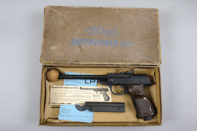 WALTHER A .177 LP53 AIR PISTOL, NO. 105667 9 1/2-inch barrel with ramp fore sight and adjustable rear sight, crackle finished frame and chequered composition grips, in its maker's box with cocking aid, barrel weight, etc |