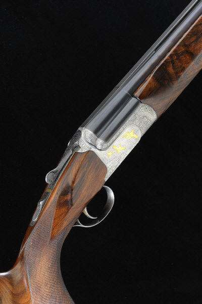 PERAZZI A 12-BORE GALEAZZI ENGRAVED "SCO ORO" MODEL SINGLE TRIGGER OVER AND UNDER EJECTOR GUN, NO. 64883 31 1/2-inch monobloc barrels with 2 3/4-inch chambers, fitted with Briley interchangeable choke tubes, machined ventilated rib, the frame, top lever and hand detachable trigger block engraved with bouquet and scroll work surrounding detailed scenes of gold inlaid game birds against realistic landscapes, signed by the engraver 'Galeazzi', removable trigger block with gold washed lockwork, 15 1/4-inch well figured stock including rubber recoil pad, 8lb. 8oz., nitro proof, fore-end possibly replaced, in its maker's plastic case with spare chokes, etc S2 The gun was built in 1985 and is engraved by master engraver Angelo Galeazzi. |