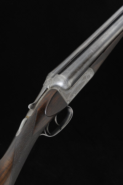 CHARLES LANCASTER A 12-BORE "A&W SPECIAL" MODEL BOXLOCK EJECTOR GUN, NO. 11657 30-inch barrels with 2 1/2-inch chambers, about true cylinder and full choke borings, doll's head extension, the frame and patent top lever with fine scroll engraving and retaining traces of original hardening colour, intercepting sears, 14 1/2-inch figured stock including rubber recoil pad, 6lb. 12oz., nitro proof, leather case S2 |