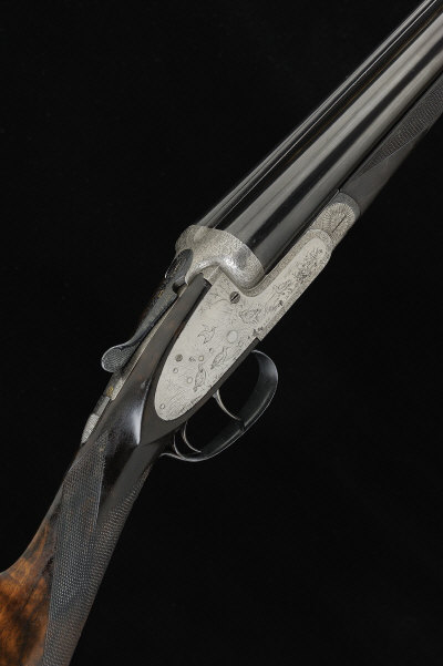 AUG. LEBEAU A BELGIAN 12-BORE SIDELOCK EJECTOR GUN, NO. 38696 29 1/2-inch Whitworth steel chopper-lump barrels with 2 1/2-inch chambers, about 1/4 and 1/2 choke borings, machined rib, mid extension, the frame, locks and gold numbered top lever with scroll engraving, the lock plate with scenes of game in landscapes, some small areas of pitting, cleaned bright overall, 14 1/4-inch highly figured stock, broken and repaired at the hand, 7lb. 2oz., nitro re-proof, barrel wall thickness below the recommended minimum S2 |