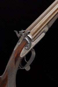 27 1/2-inch Damascus barrels, the frame, bar locks, hammers and rotary underlever with fine scroll engraving, 14 1/2-inch figured stock with pistol grip and steel butt plate, 6lb. 10oz., black powder proof, bores pitted