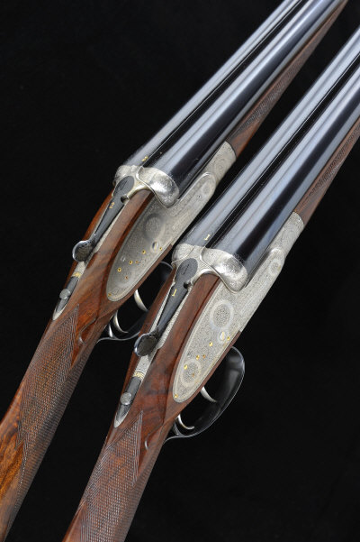 28-inch chopper-lump barrels with 2 1/2-inch chambers, about 1/4 choke borings, engraved breeches, the frames, locks and gold numbered top levers with fine bouquet and scroll engraving, the maker's name signed within a scrolling banner, gold lined cocking indicators and gold washed lockwork, 15 1/4-inch highly figured stocks including 1 1/2-inch well-matched extensions, 6lb. 5oz., nitro proof, in their maker's lightweight leather case