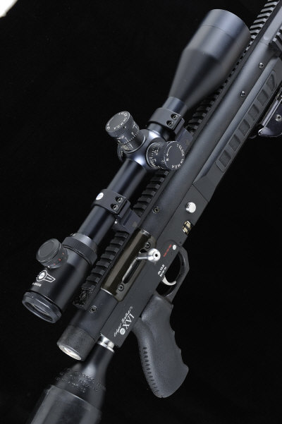 EDGAR BROS. A .22 MODEL XVI RE-CHARGED AIR RIFLE, NO. 780 23-inch barrel with sound moderator, the matt blacked frame with receiver, mounted with a DMP Tactical 6-26x56 telescopic sight, detachable reversible rotary magazine, removable air bottle stop, 11lb. 10oz., in its maker's nylon bag |