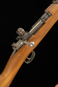 29-inch barrel with raised foresight and bed for ladder rearsight, the Mauser type receiver dated 1944 and fitted with an aperture sight, bolt with flag safety, full length stock with steel butt plate, 14-inch pull, 10lb., nitro proof