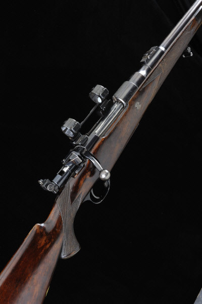 24 1/2-inch barrel with ramp fore sight with folding shade, rear sight with folding leaves, the receiver fitted with Holland & Holland quick detachable mounts, the bolt with side safety and cocking piece mounted peep sight, magazine with hinged base plate, recoil stud, the half length stock with pistol grip, cheekpiece and ribbed butt plate, sling swivels, 7lb. 14oz., nitro proof