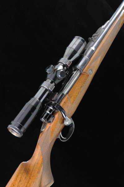 23-inch barrel with ramp fore sight with folding cover, short raised rib with folding leaf sight to 300, the receiver mounted with a B. Nickel Marburg 2.5-7x telescopic sight, in Holland & Holland type quick detachable mounts, bolt with side safety, the receiver ring and hinged magazine base plate with scroll engraving, recoil stud, the half length figured stock with pistol grip, cheekpiece and recoil pad, 14-inch pull, 9lb. 5oz., nitro proof