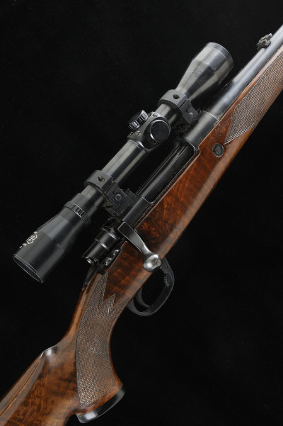 24-inch barrel with ramp fore sight and folding rear sight, the receiver mounted with a Pecar Champion 4x telescopic sight, bolt with side safety, magazine with hinged base plate, recoil stud, the highly figured half length custom stock with pistol grip, cheekpiece and rubber recoil pad, 13 1/2-inch pull, sling swivels, 8lb. 6oz., nitro proof