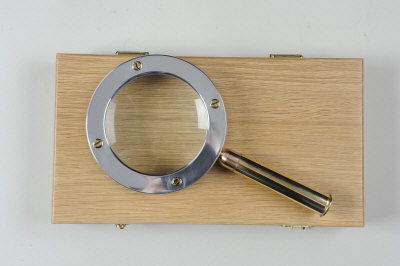 A .700 CARTRIDGE MAGNIFYING GLASS the attractive glass with the handle in the form of a .700 nitro express cartridge, polished aluminium frame, in its oak case |