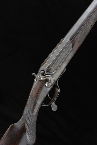 36-inch barrel with 3 1/4-inch chamber, about full choke boring, the plain frame, rebounding back lock, hammer and rotary underlever retaining traces of original hardening colour, 14 1/4-inch figured stock with pistol grip and chequered butt plate, cracked and profesionally repaired at the hand, 13lb. 2oz., recent nitro re-proof