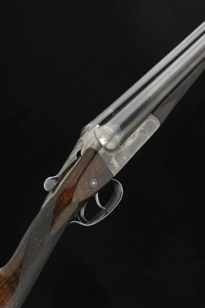 28-inch barrels with 2 1/2-inch chambers, about 1/4 and full choke borings, crossbolt extension and engraved breeches, the frame and top lever with fine scroll engraving and retaining traces of original hardening colour, automatic side safety, 14 3/4-inch well figured stock including 1/2-inch horn ribbed butt plate, 6lb. 8oz., nitro proof, in its maker's leatherbound canvas case